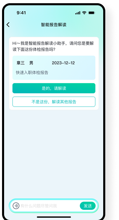AI 深度解读体检报告,通过医学知识库比对,对异常指标进行三级预警标注,用通俗语言拆解专业术语;依据报告自动生成个性化健康计划,涵盖饮食禁忌、运动方案及作息建议;实时同步日常健康数据,生成动态趋势图谱;智能推算复查周期,提前 7 天推送提醒,让健康管理更精准。